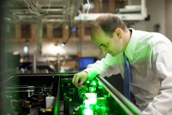 Three University of Chicago chemists have created a new way to assemble what they call “designer atoms” into novel materials with a broad array of potentially useful properties and functions. These designer atoms are nano crystals—tiny crystalline arrays small enough that new quantum phenomena begin to emerge but large enough to provide building blocks for new functional materials and substances that could be useful in harvesting solar energy and delivering quantum computing. Greg Engel, associate professor in chemistry, is pictured here tuning a femtosecond laser system used to dissect couplings between nano crystals.