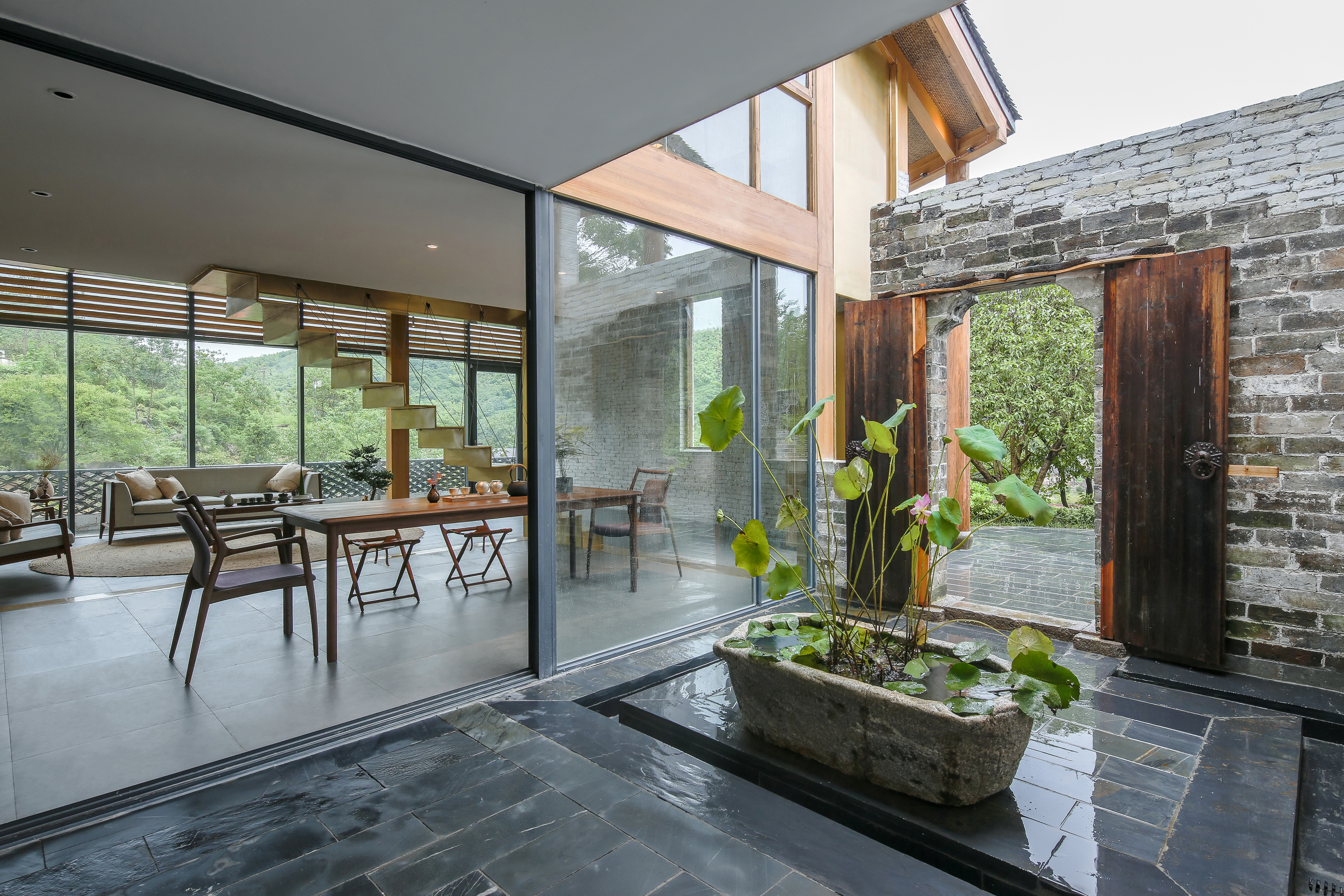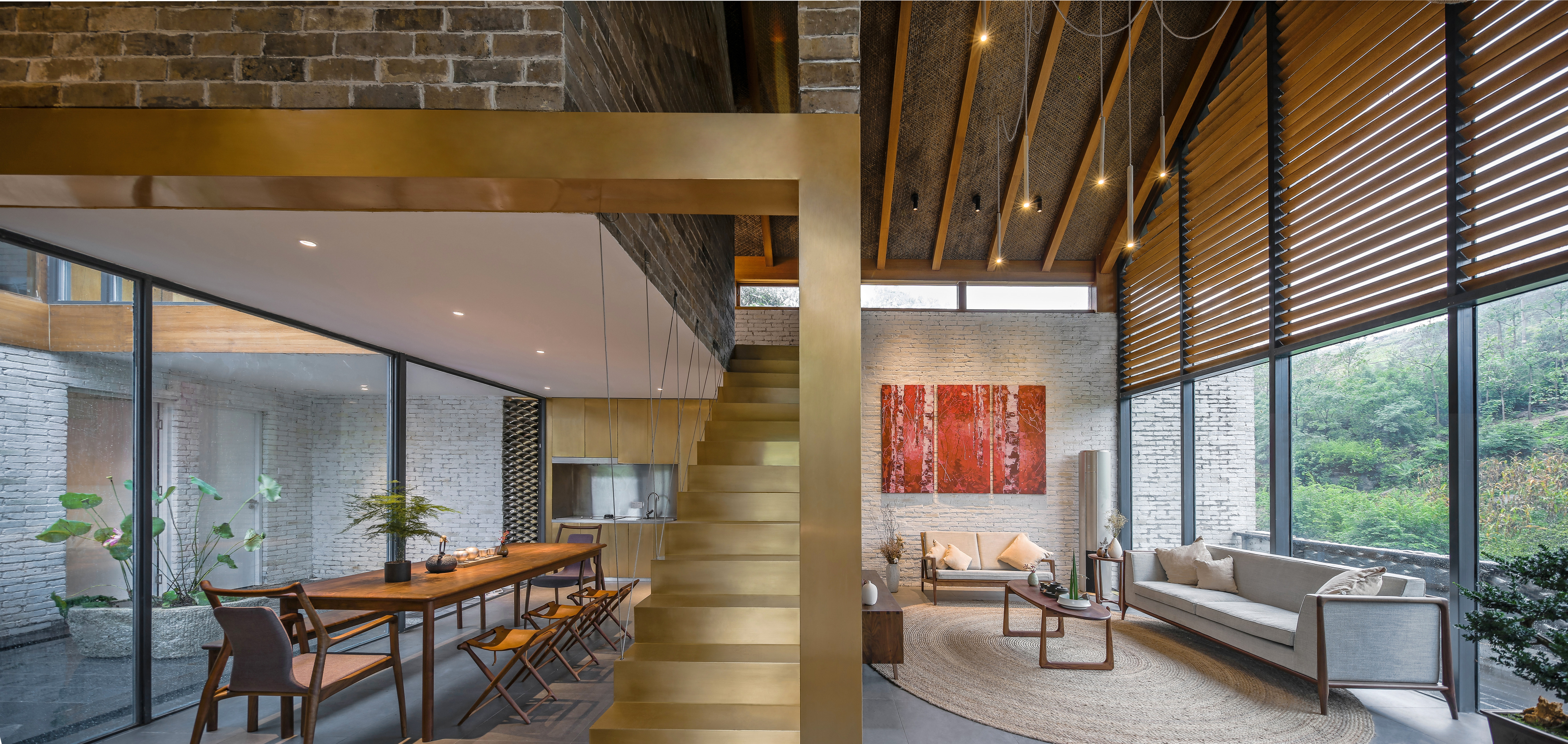 The main internal space and the external gallery were shaped by the interlaced new and old walls, which made the previous damaged walls into indoor walls and interior partitions. Terrace, living room, dining room, kitchen and courtyard lined up westwards according to the decrease of their privacy.